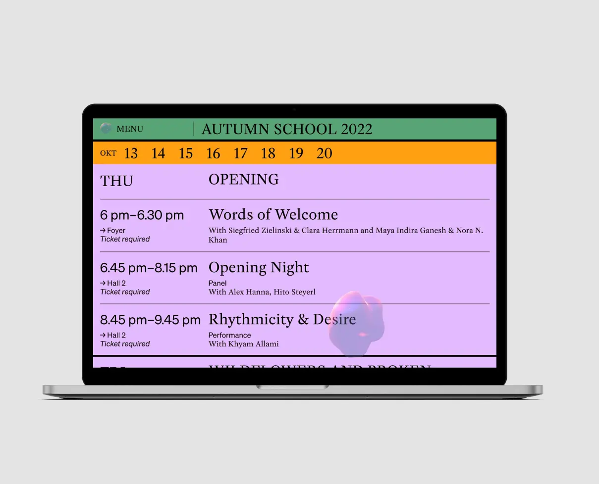 Basierend auf dem Algorithmus der Metaballs aus den frühen 1980ern entwickelten wir ein visuelles System, das sich fluide in den Dimensionen verhält. In einer scheinbar chaotischen und gesetzlosen Art und Weise verbinden und bewegen sich Formen durch den virtuellen Raum um sich immer wieder zu verbinden. Basierend auf dem Visual entstand die Website. Hier sind der Ablauf, Inhalte und die Teilnehmenden der Autumn School zu finden.