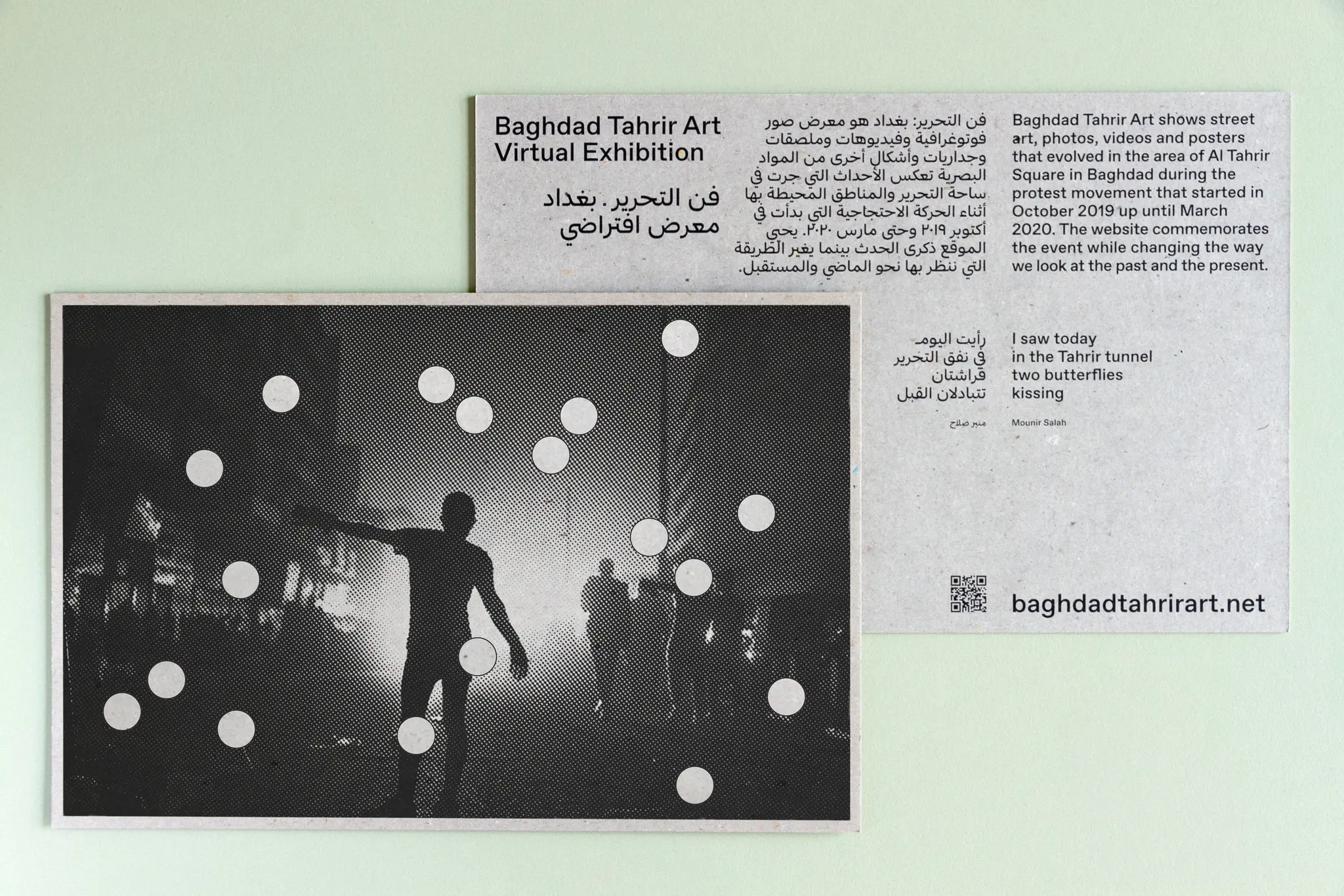 Neben der Website entstand eine großformatige Postkarte aus Buchbinderpappe, die auf das Projekt aufmerksam machte. BAGHDAD TAHRIR ART versteht sich dabei als ein Archiv politischen Ausdrucks, das durch anonyme Einsendungen wachsen soll.
