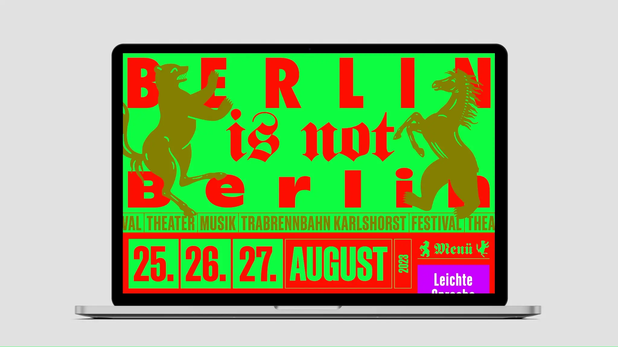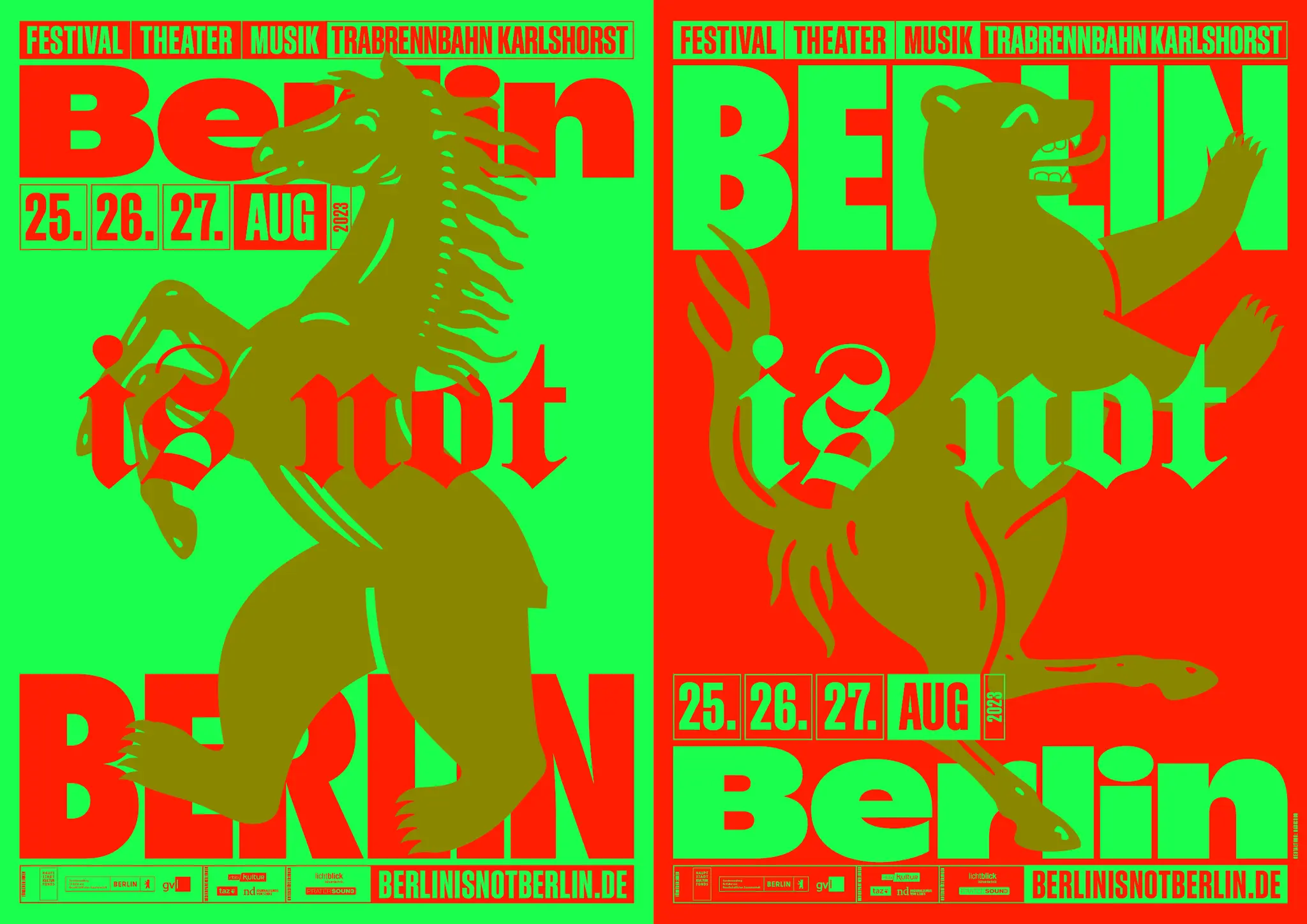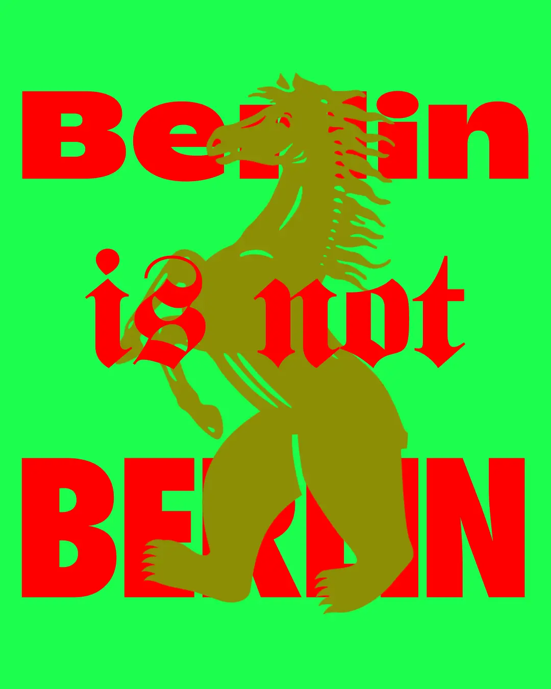 Das Erscheinungsbild von BERLIN IS NOT weckt Assoziationen zu Wettscheinen, der Zirkuswelt und DIY-Kultur. Es findet sich auf den Rapport-Plakaten im Berliner Stadtbild ebenso wieder wie auf Flyern, Anzeigen, Stickern, Social Media-Posts und der Website.