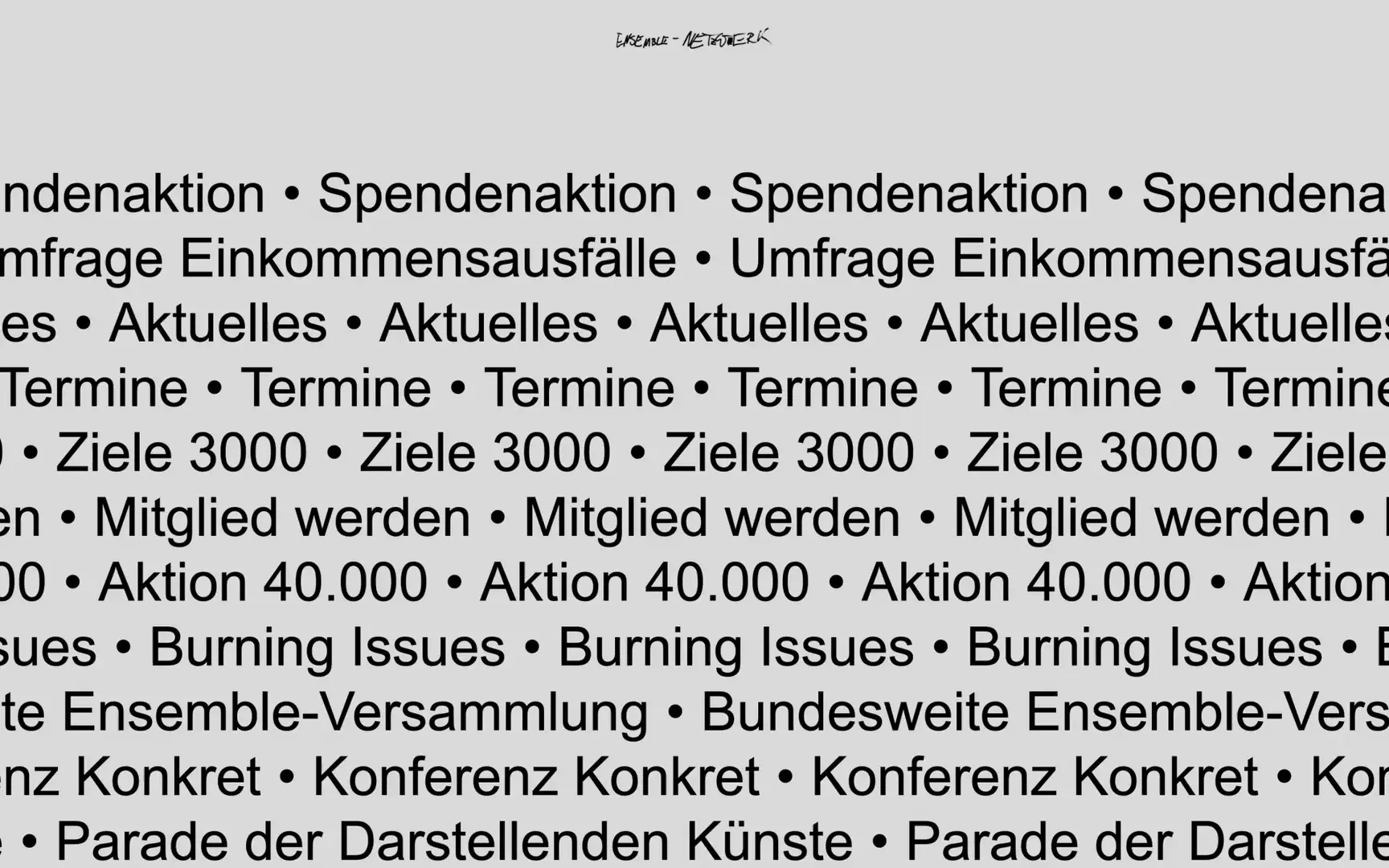 Die neue Website für das ensemble-netzwerk sammelt die verschiedenen Kampagnen, Konferenzen und Projekte. Sie gibt einen Einblick in die Arbeit des netzwerkes und seiner Arbeitsgruppen. Ein zentraler Bestandteil ist die lange Liste der Mitglieder, die in Ticker-Form den Bildschirm durchläuft.