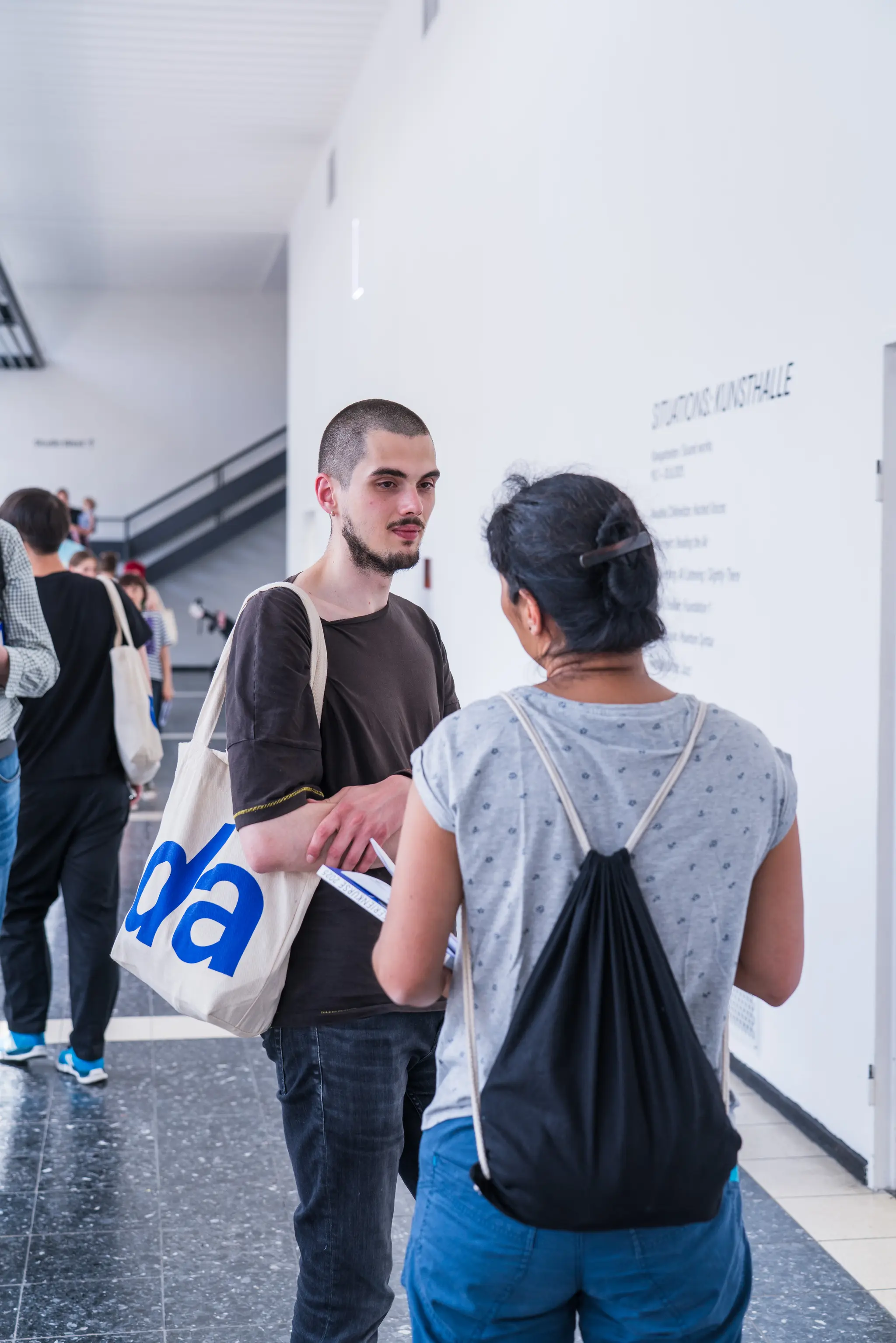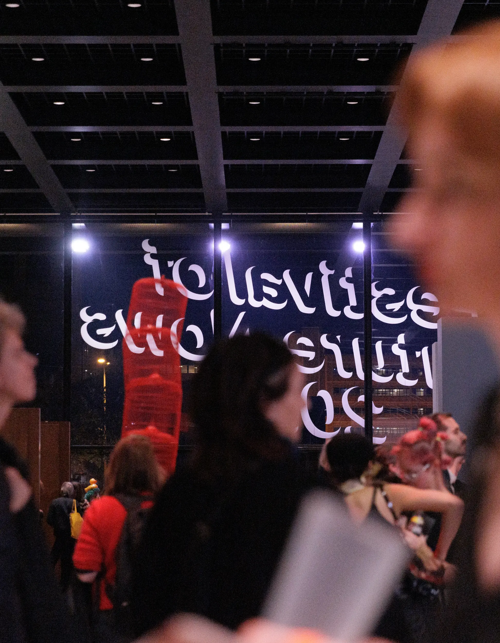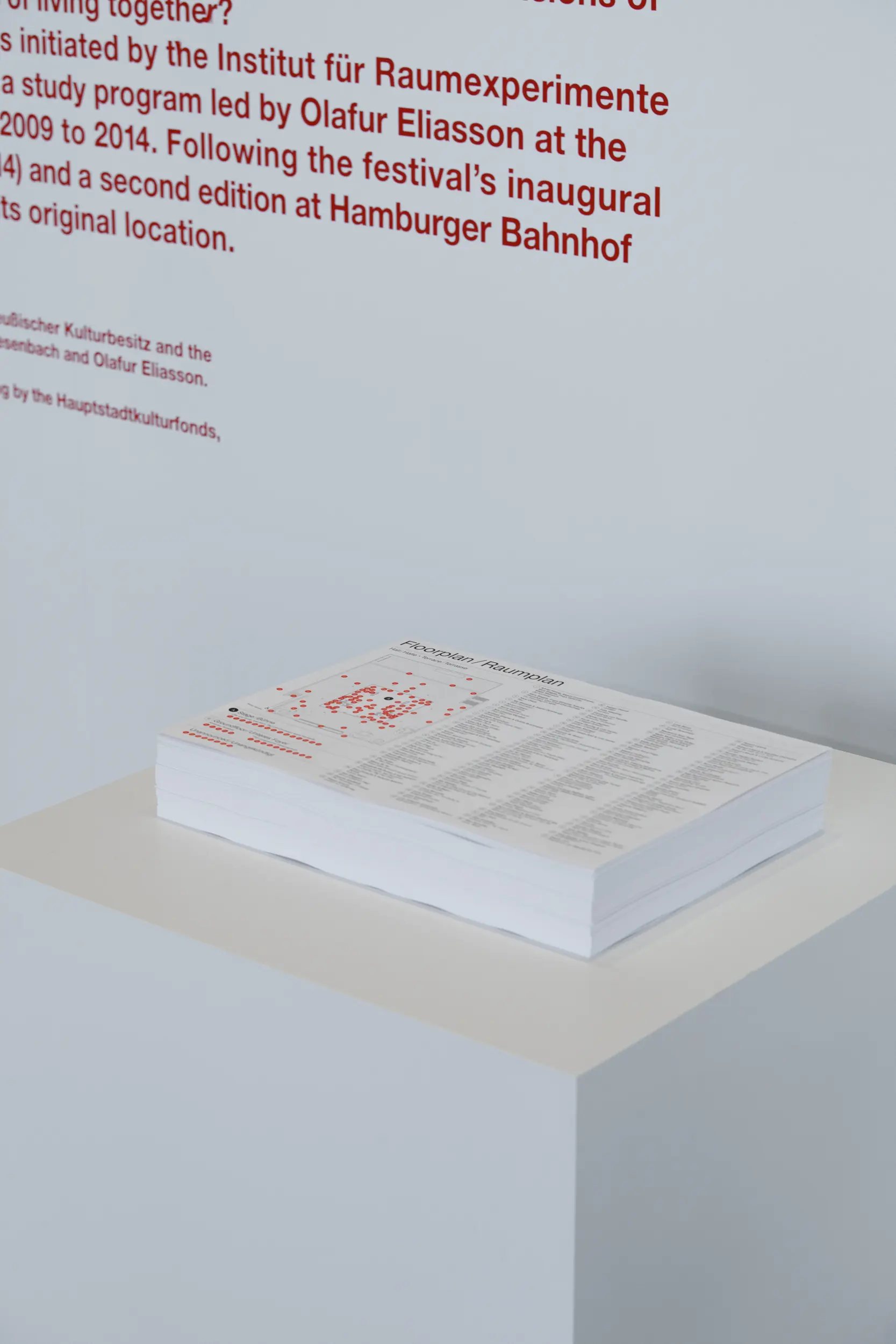 Schwarz und Weiß bilden die Hauptfarben und schaffen Raum – eine Bühne für die Vielfalt der künstlerischen Positionen und ihrer Werke. Rot wird gezielt als Akzentfarbe eingesetzt: Sie dient der Orientierung der Besucher:innen, zum Beispiel auf dem Floorplan in Form von über 100 Punkten, die sich im Raum wiederfinden. Auch die Typografie im Foyer greift Rot auf, signalisiert den Eingang und lädt die Besucher:innen ein, von hier in die Ausstellung zu starten.