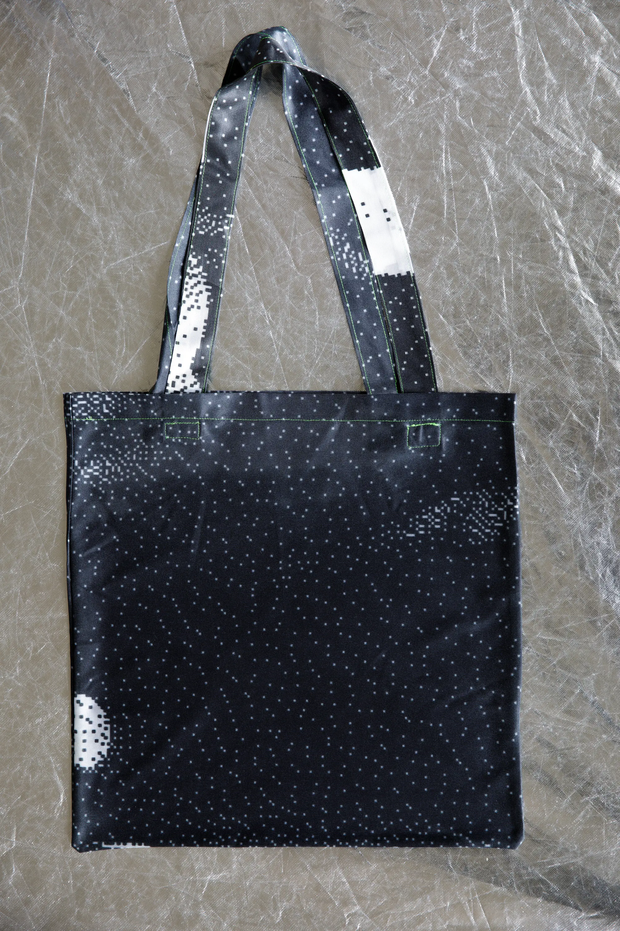 Nach dem Ende von Scratching the Surface fanden die beiden Fahnen den Weg in unser Kreuzberger Büro zurück. Unserer Vorstellung von nachhaltiger Arbeitsweise folgend, recycelten wir die Flaggen und machten uns daran, mit Schere und grünem Garn eine kleine Edition von 30 Unikaten herzustellen.