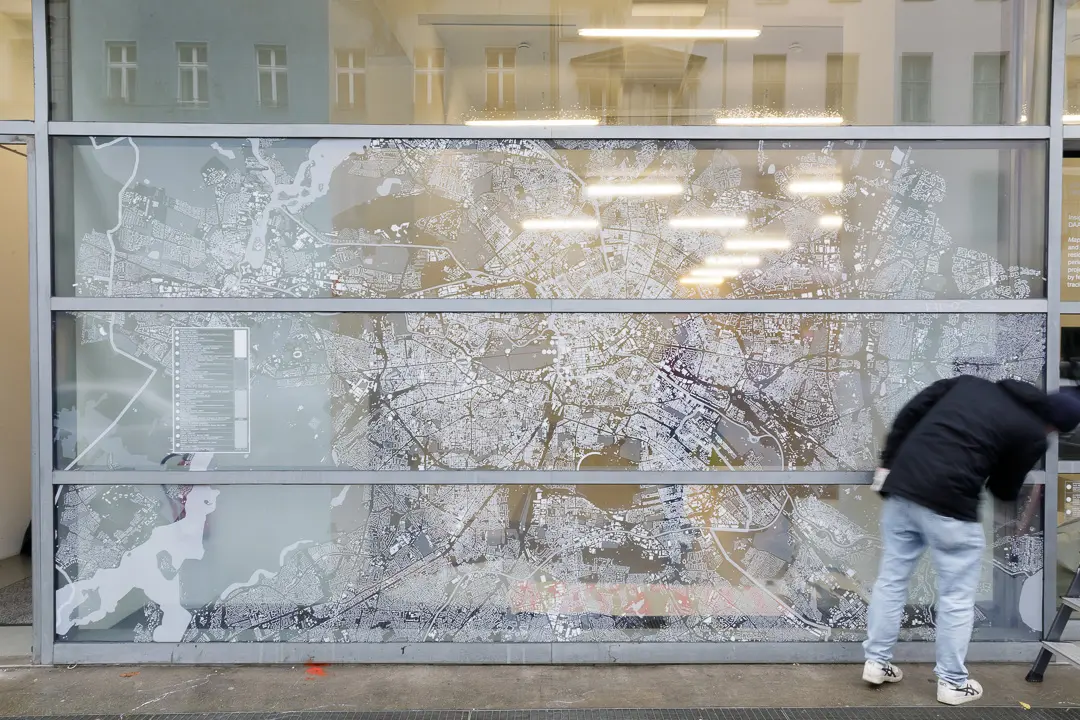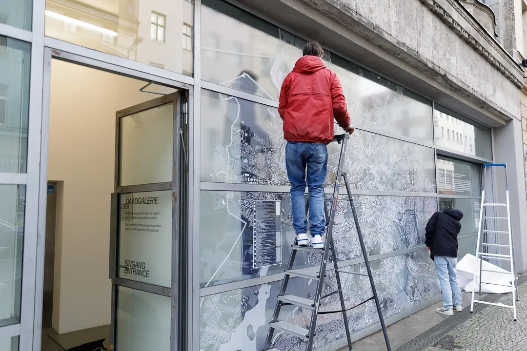 In der zweiten Iteration nahm Mapping the Archive die Form einer Schaufensterausstellung an. Von Dezember 2024 bis Januar 2025 schmückte unsere Karte die Fensterfront der daadgalerie und kontextualisierte die im Fenster präsentierte Auswahl an neu digitalisiertem Filmmaterial.