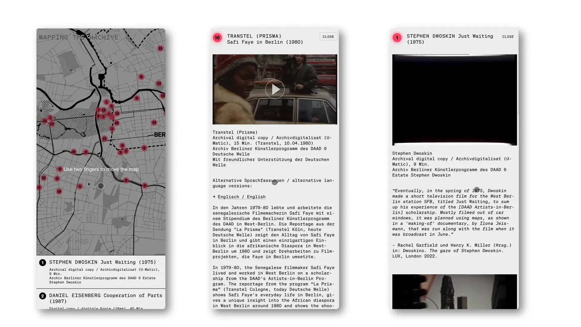 Die interaktive Website ermöglicht es Nutzer:innen, historische und künstlerische Dokumente zu lokalisieren, einzuordnen und zu erkunden. Dabei erschließt sich ein kontinuierlich wachsendes Netzwerk aus bestehendem und neu digitalisiertem Bild- und Tonmaterial. Durch Ausstellungen, performative Interventionen und Filmvorführungen wird das interaktive Archiv regelmäßig aktiviert und in den aktuellen Kontext übersetzt.