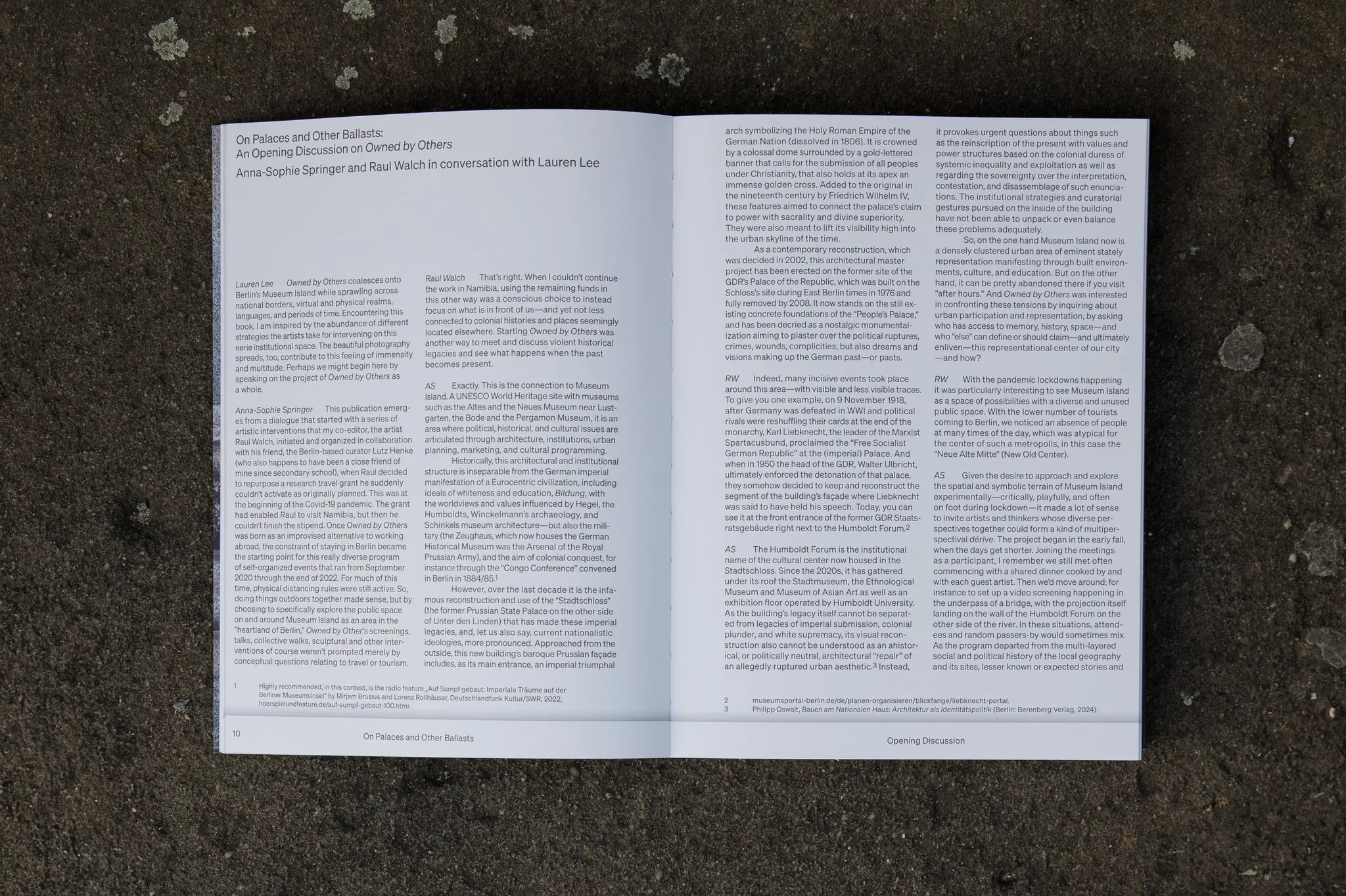 Die Publikation soll Leser:innen zu eigenen Spaziergängen in der Gegend anregen und knüpft an eine Reihe von ortsspezifischen Arbeiten an, die von der Initiative Owned by Others organisiert wurden. Darunter die Umgestaltung eines ehemaligen Ladengeschäfts eines karibischen Reisebüros in das Museum Tropicana – vis-à-vis des Stadtschlosses/Humboldt Forums. Owned by Others enthält Bilder und Texte von Künstler:innen, die über das Museum Tropicana sowie damit verbundene Agitprop-Events und -Projekte reflektieren. Darüber hinaus umfasst die Publikation neu in Auftrag gegebene und übersetzte Essays zur Psychogeographie Berlins und bietet eine Gegenvision zur reaktionären Stadtplanung, die auf der Museumsinsel vorherrscht.