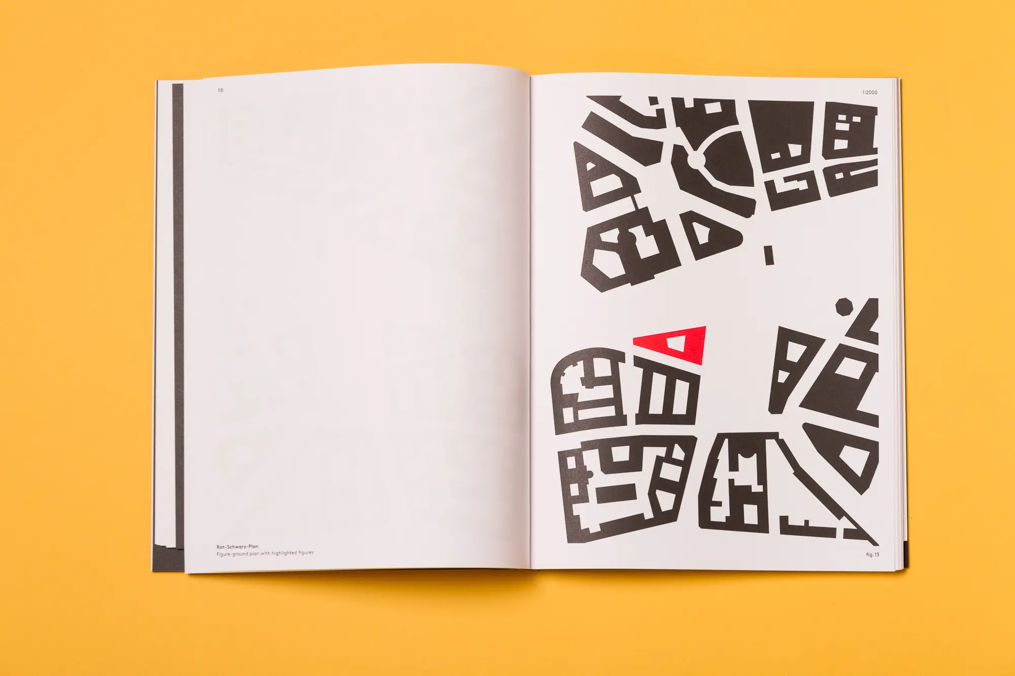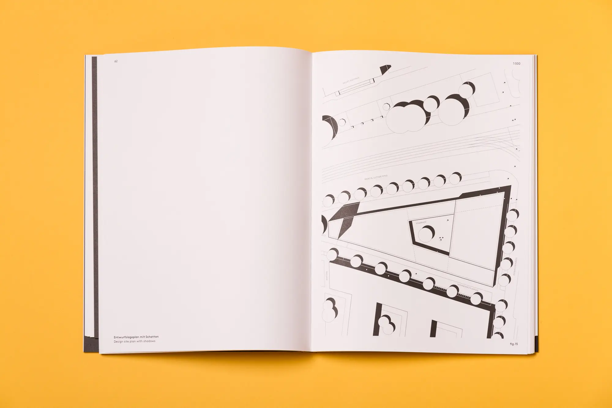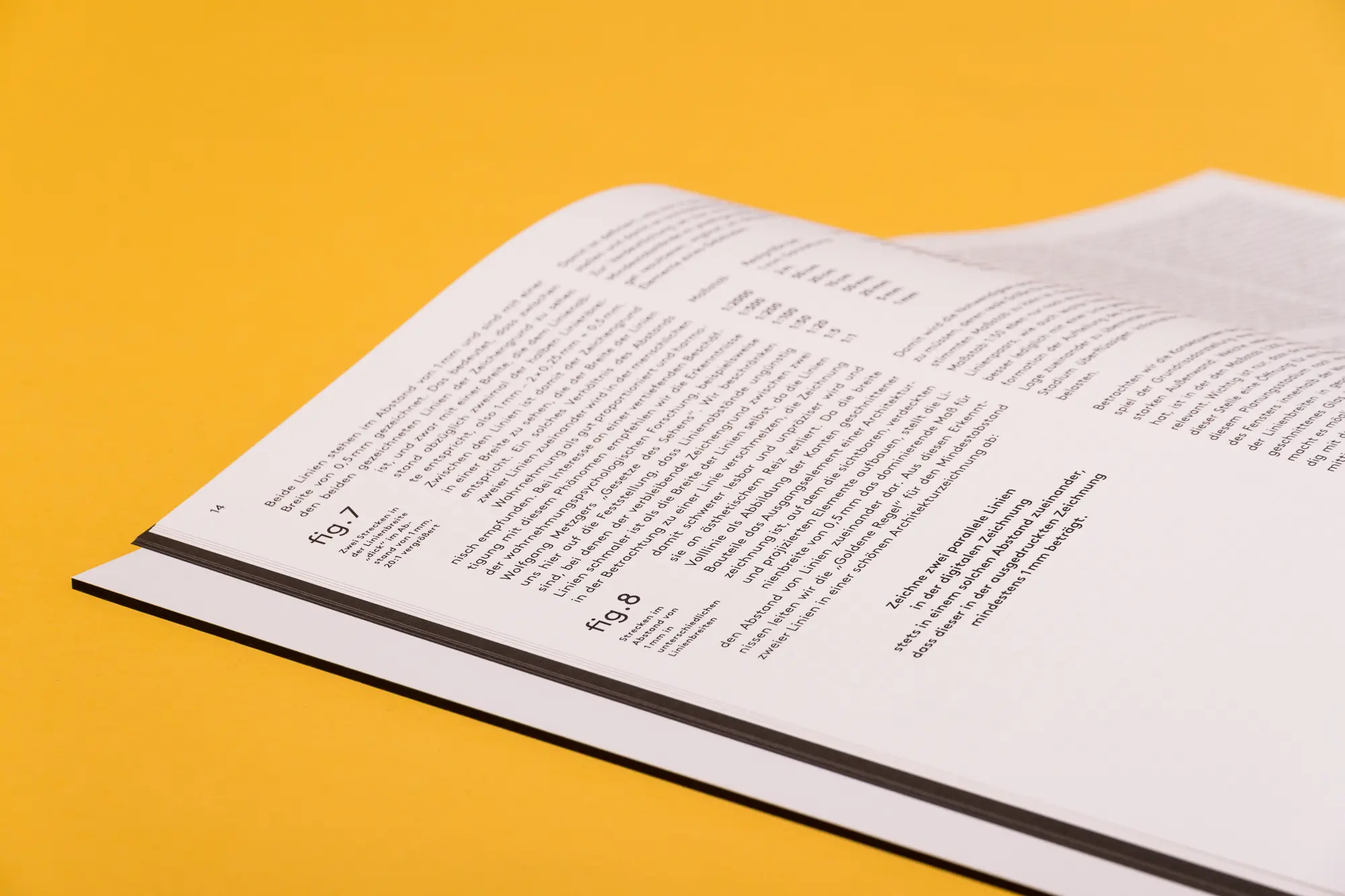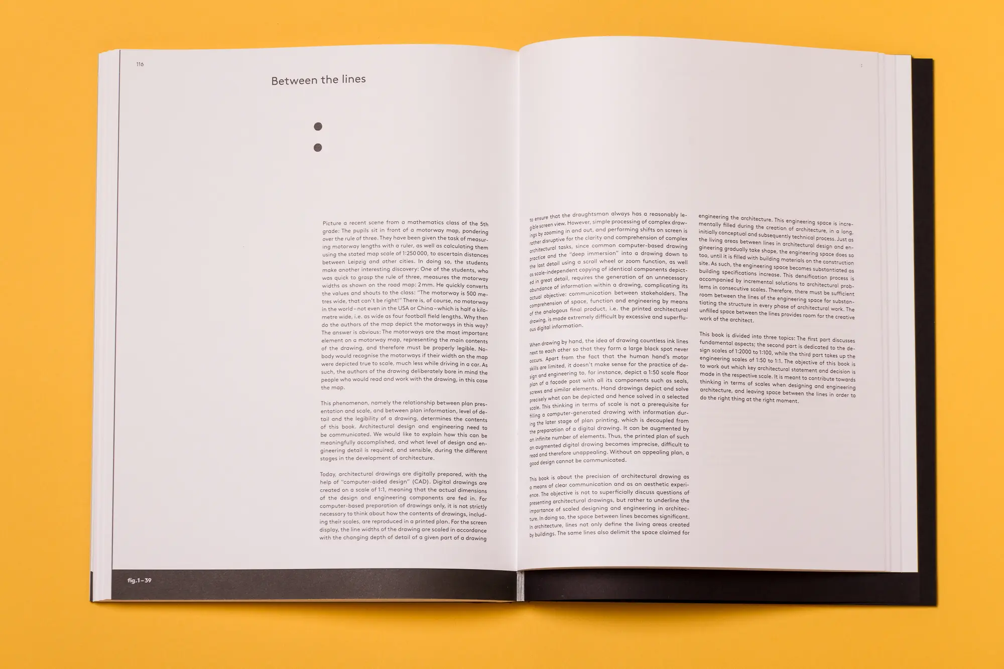 Das Buch ist komplett in Schwarz und Weiß gehalten. Der Buchdeckel aus durchgefärbter schwarzer Römerpappe ist weiß geprägt und in der Mitte gestanzt. So entsteht ein kleines Fenster im Buchdeckel, welches „die goldene Regel” der beiden Architekten zeigt: den Mindestabstand zweier Linien zueinander, der in einer guten Architekturzeichnung nie geringer als 1 Millimeter sein darf.