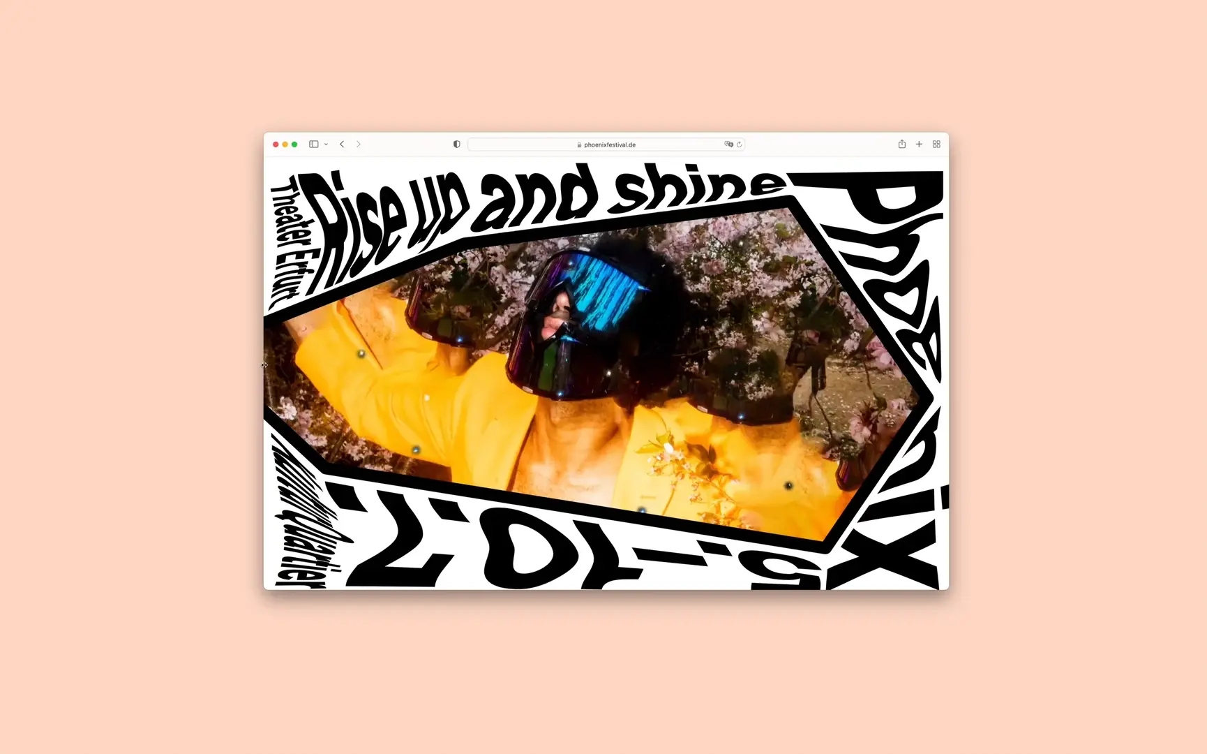 Für das Erscheinungsbild der zweiten Festivalausgabe arbeiteten wir mit dem Fotografen Simon Hegenberg zusammen. Das diesjährige Motto „Rise up and shine“ wurde von uns in eine Bildwelt übersetzt, in der Mystik und Kitsch, Plastik und Abstraktion eng beisammen liegen. Die entstandenen Fotografien vervollständigten wir mit verzerrter Typografie und schwarzen, deformierten Bildrahmen zu einem psychedelischen Spiegelkabinett.