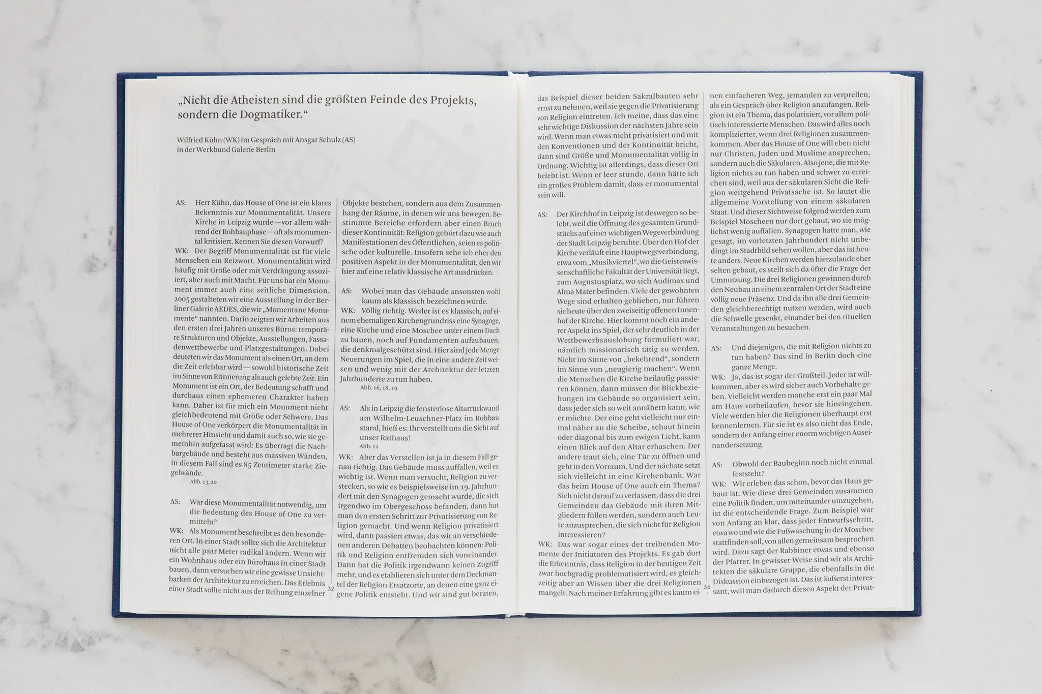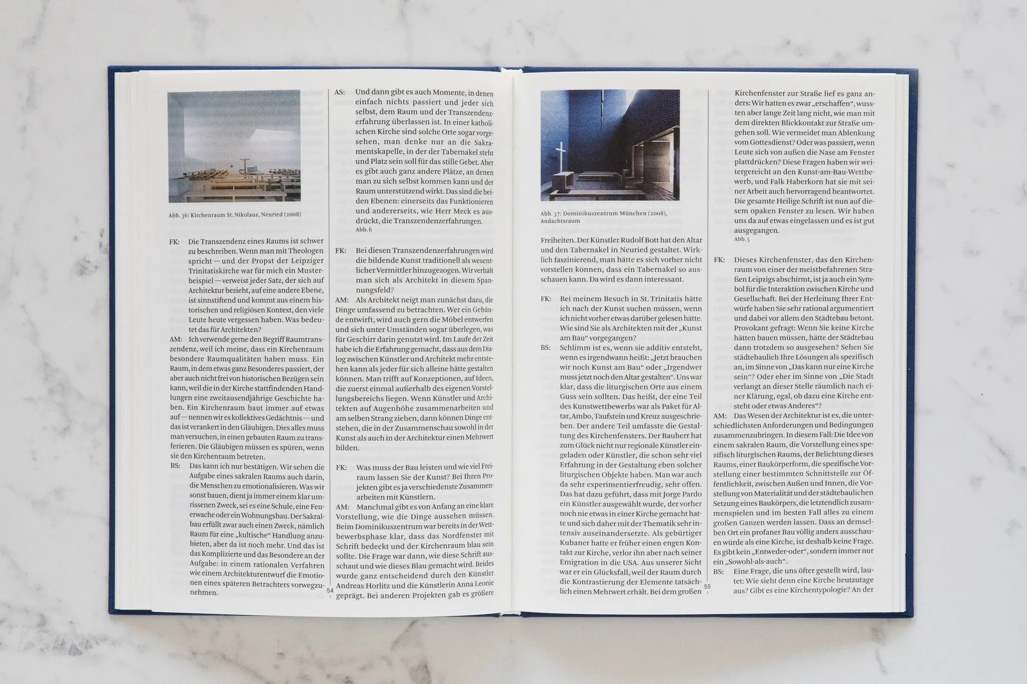 Das Buch stellt fünf wichtige Sakralbauten vor, die zum Teil noch in Planung sind, und ordnet sie mit prägnanten Texten in den städtischen und gesellschaftlichen Kontext ein, von der Zentralmoschee in Köln bis zum House of One in Berlin. Der schweizer Kirchenbauer Mario Botta würdigt zudem die Propsteikirche St. Trinitatis in Leipzig als „Zeichen unserer Zeit“.