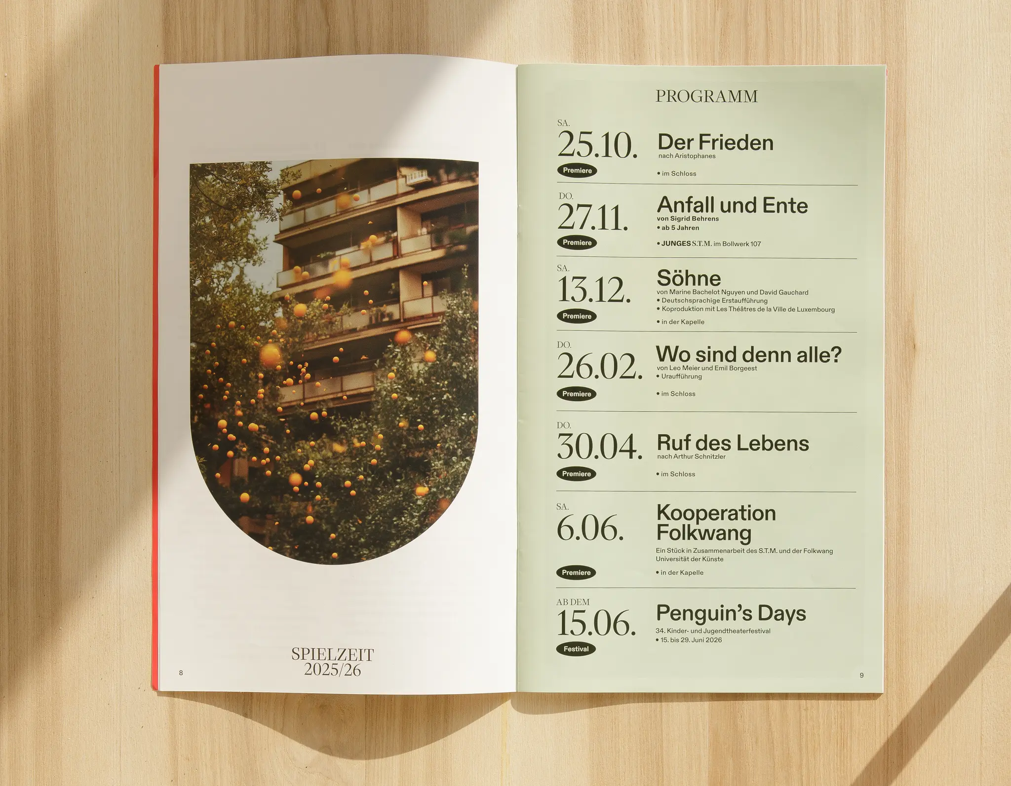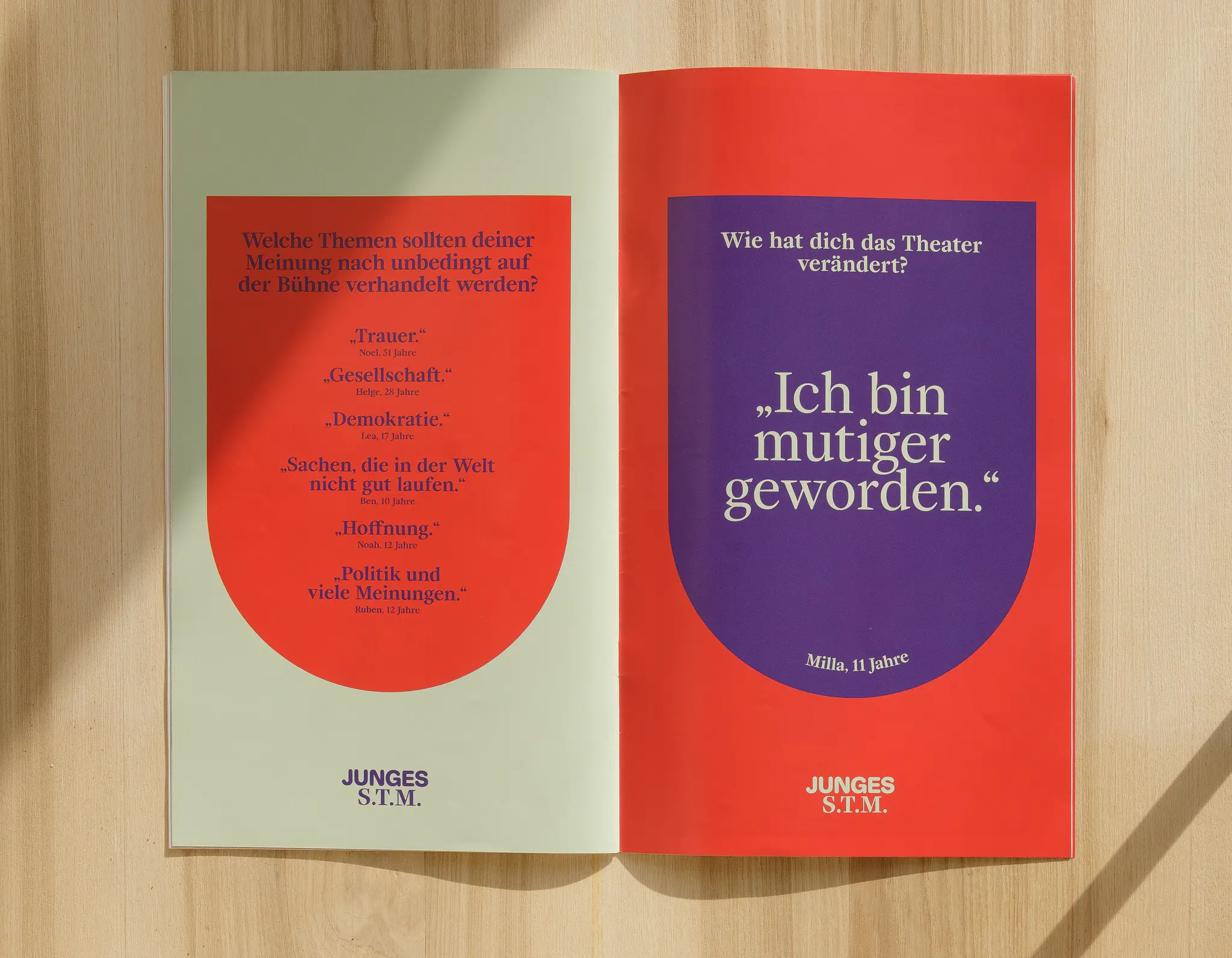 Zur Ausstattung des S.T.M. gehören auch die von uns gestalteten Spielzeithefte und die vierteljährlich erscheinenden Leporellos, Kommunikationsvorlagen, Hard-Tickets, Merchandise und Fahnen. Wir freuen uns außerdem, Sparring-Partner für Interior-Design gewesen zu sein, und sind gespannt darauf, auch über die kommenden Jahre hinweg genauso weiterzumachen – als Partner für Strategie, Gestaltung, Fragen und Lösungen.