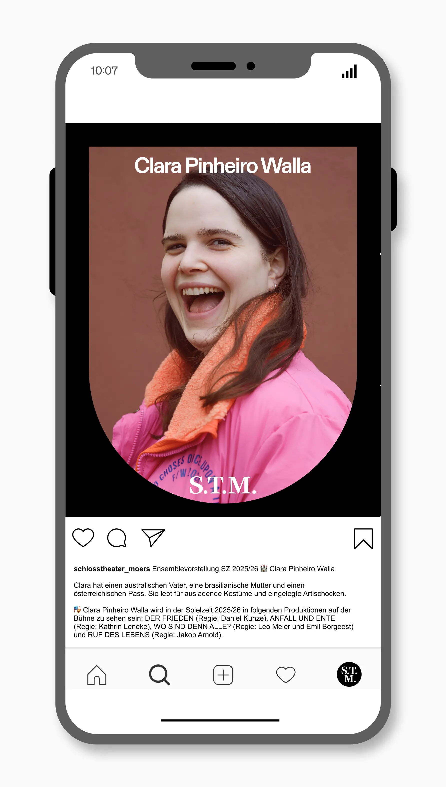 Zum Auftakt der Spielzeit waren wir auch für die Konzeption und Ausführung der Ensemblevorstellung auf den S.T.M.-Social-Media-Kanälen zuständig. Wer ist neu mit dabei? Wen kennt ihr schon? Was macht das Ensemble aus? In Posts, Reels und Stories stellen sie die Darsteller:innen vor und erzählen von ihrem Engagement in Moers.