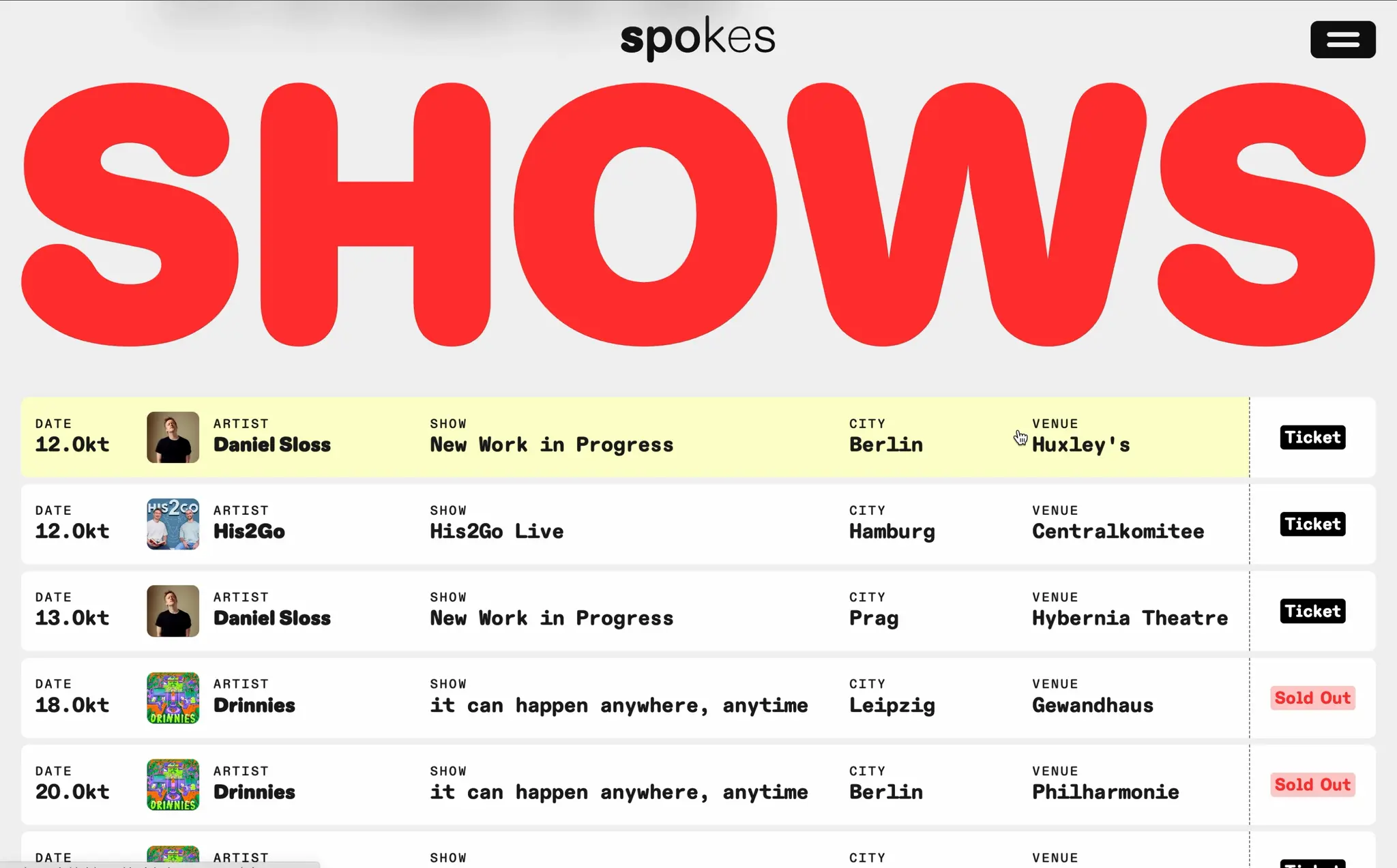 Spokes ist eine Berliner Agentur für Booking und Live-Promotion, die sich auf Comedy, Podcasts und Spoken Word spezialisiert hat.