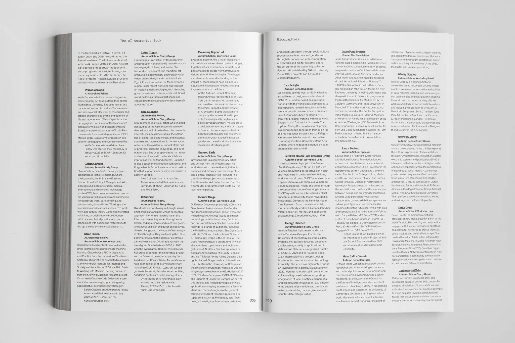 Mit Beiträgen von: Sana Ahmad, Walla Capelobo, Sarah Ciston, Sara Culmann, D’Andrade, Lex Fefegha, Laura Fong Prosper, Laura Forlano, Maya Indira Ganesh, Wesley Goatley, Sarah Grant, Johanna Hedva, Bianca Herlo, Clara Herrmann, Louise Hickman, Elise Misao Hunchuck, Jac sm Kee, Nora N. Khan, KUNCI Study Forum & Collective (Nuraini Juliastuti and Fiky Daulay and Rifki Akbar Pratama), Jon (Wobbly) Leidecker, Lauren Lee McCarthy, oasis.wet (Petja Ivanova, Iyo Bisseck, Rain Rose, Kaya Anouk Zakrzewska), Mimi Onuoha, Nelly Y. Pinkrah, Luiza Prado De O. Martins, Sahej Rahal, Tiara Roxanne, Pedro J S Oliveira, Alexander Scholz, Nishant Shah, Sarah Sharma, SONDER (Peter Behrbohm and Anton Steenbock), Aarti Sunder, SUPERRR Lab (Julia Kloiber and Elisa Lindinger), Tactical Tech, The Good Robot (Eleanor Drage and Kerry McInerney), The Mycological Twist (Eloise Bonneviot and Anne de Boer), Michelle Thorne, Natasha Tontey, Lena Ulbricht, Unit Test (Martin Disley and Murad Khan), Jennifer Walshe, Jackie Wang, Tin Wilke, and Siegfried Zielenski.