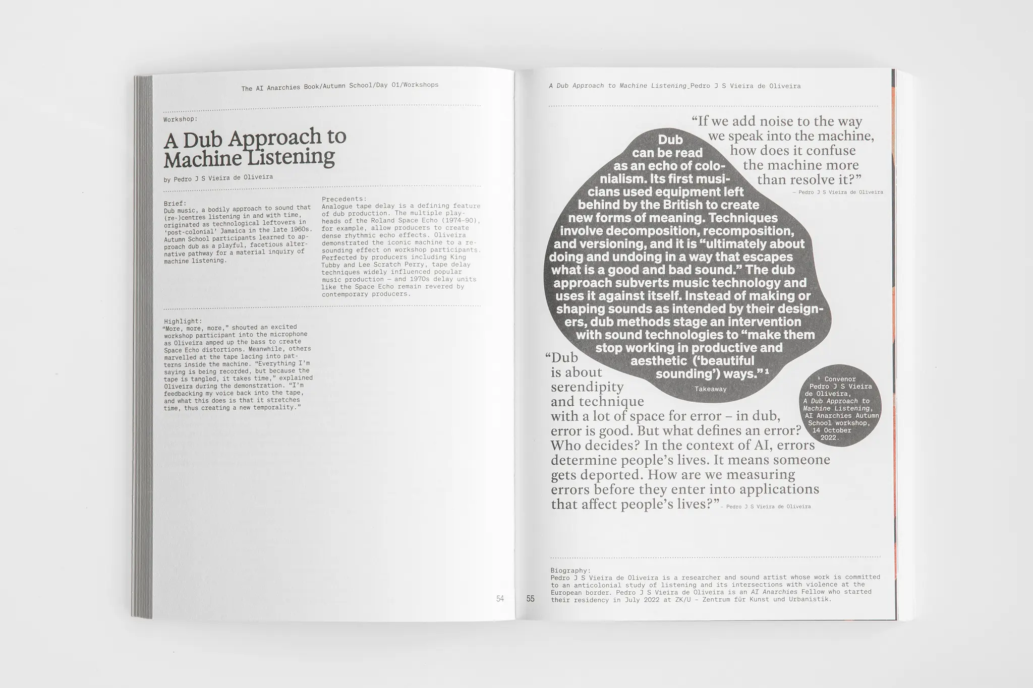Als Dokumentation, Reflektion und Toolbox vermittelt die Publikation in Essays, Interviews, Bildergalerien und Kochrezepten Wissen und Hintergründe der AI Anarchies Herbstakademie 2023 und der künstlerischen Projekte, die im Rahmen des Programms entstanden sind.